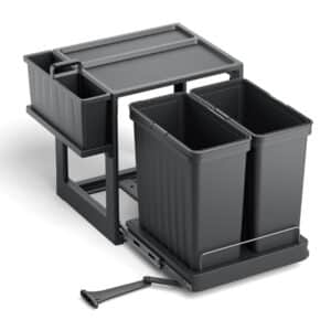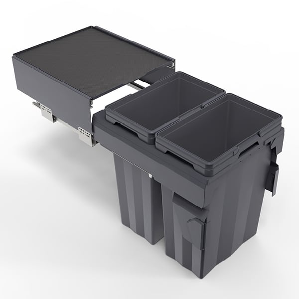 פתרון אחסון מתקדם ורחב במיוחד להפרדת אשפה במטבח. המערכת כוללת שני דליים בנפח גדול, מנגנון טריקה שקטה ומדף עליון קבוע לניצול מקסימלי של חלל הארון.